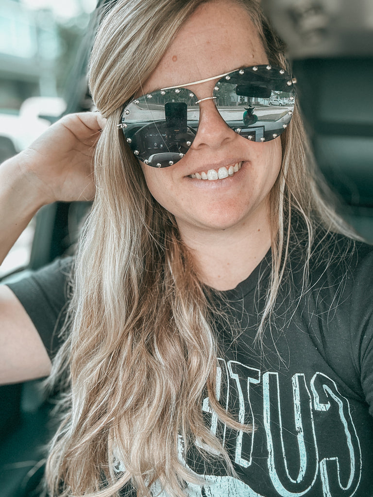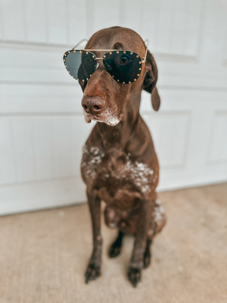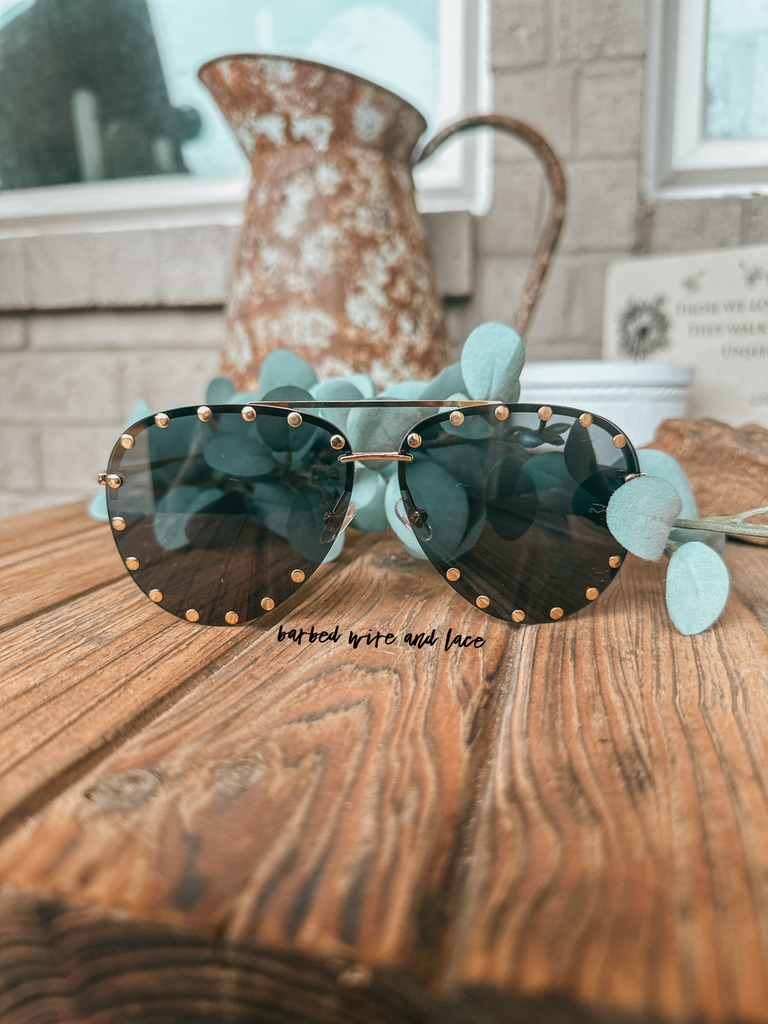 Show them who's boss with these glamorous Studded Aviator Sunglasses! These sunnies feature a classic aviator design with gold wireframes and matching brow bar. Dainty gold studs add some extra glam along the tinted black lenses to finish the look!